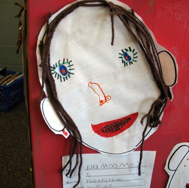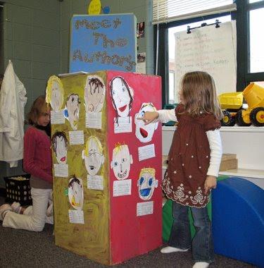 We had a wonderful afternoon at the Author’s Tea in E’s room. The whole class recited a very nice poem about being an author and then the kids and parents went to the table to read the works. Fine literature was had by all. The kids shared their books, then we switched and read some others. Tea and goodies were consumed, a rousing game of “Guess the Sentence” took place, and then the kids got a special notebook treat from their teacher. The whole room was decorated with a podium featuring each author and a bit of biography, paper flower arrangements, and delightfully whimsical tablecloths. E’s portion above says Mrs. Danielle “Okay children, eyes on me.” And that’s the class below.