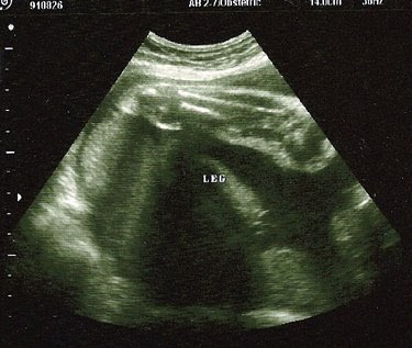 Bones of one leg (knee joint in the top left hand corner). The leg length and activity have gotten comments at all the later ultrasounds.