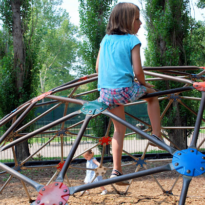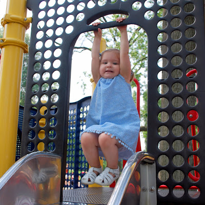 The hanging bars above the slides are the perfect height. No sliding, just swinging. Those in line behind her aren’t too thrilled.