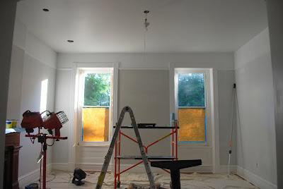 On a day where everyone’s all red-white-and-blue, I’m talking gray. There she is. The middle section is painted the final sample color – the chosen one. This photo was taken several days ago, before the trim was all painted shiny white. It looks so pretty and light-filled when we stand in there that we just want to replace those old drafty windows with new ones, (clean the glass every once in awhile), and never hang another thing on them. But we feel a little exposed in there at night, the windows are so large. I think I’ve nixed the idea of hanging big curtains in there. The windows and trim really are nice, and curtains just hide it all. Still contemplating what to do. We’ve got pricing on new windows and if we go that route I think all we’ll be able to afford is more of the brown craft paper for privacy. It’s a good look, I think.