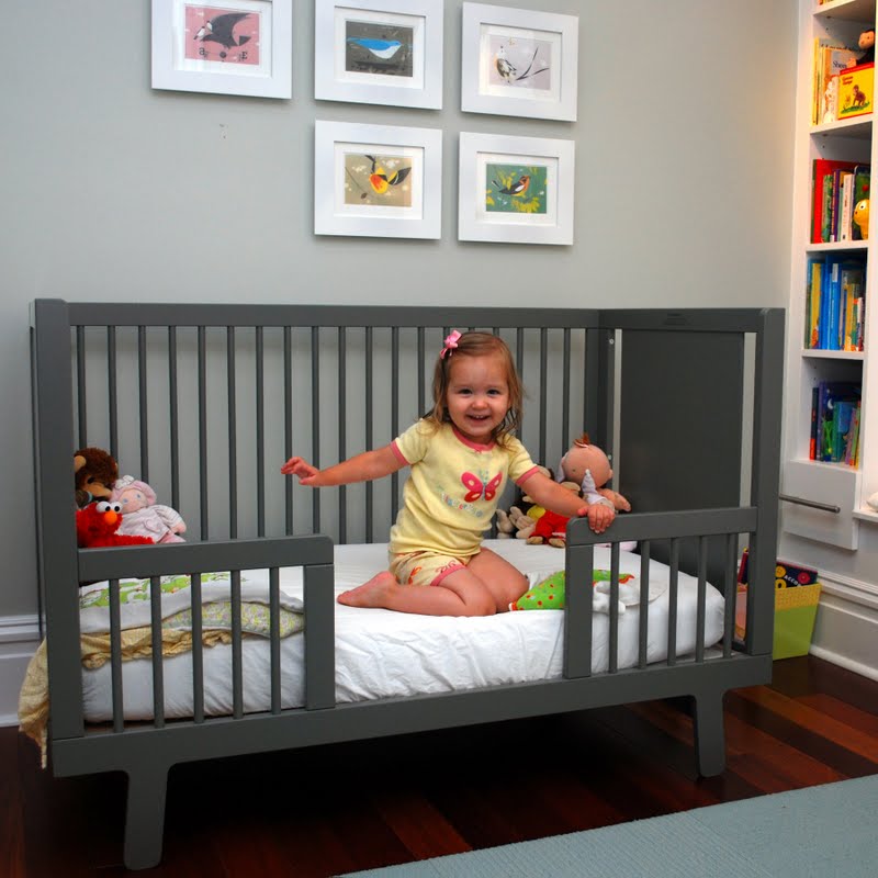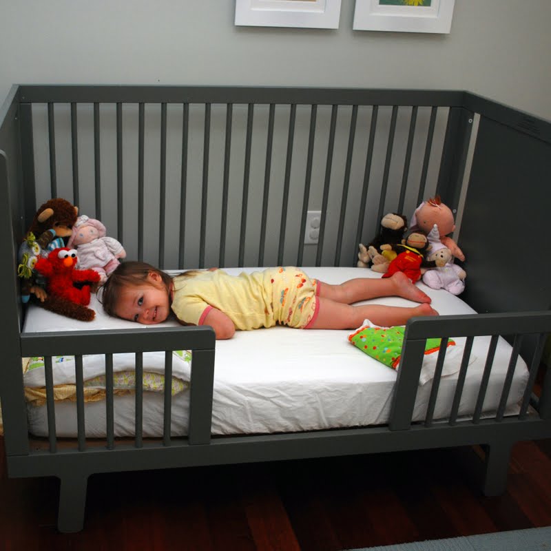 We bought the conversion kit shortly after we got the crib. We loved the crib so much that we thought we might get some extra use out of it as a smaller bed before moving her into a standard bed. This configuration gives more play area in the middle of the room too, and it seems to meet her “nesting” needs – I just went up to check in on her and she’s all bunched up in one corner, lying across the bed, feet through the slats, just as she did when it was a crib.