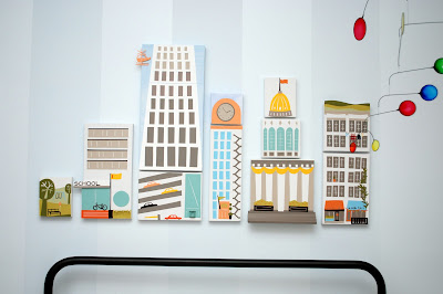 Here’s the latest (and probably last) addition to the cityscape for my nephew. The park. I thought of putting a kite, but then the balloon seemed right. And I love it. I drew inspiration for the trees from the book Follow the Line, which was the starting point my sister gave me when she asked me to do this for C. Once I finished the park, I really wanted to put these on the wall, step back and look at them for a few days. And since M was at work (self-punishment for taking a vacation day on Friday) and E was still up (and suddenly hyper), we decided to hang them with museum putty and stand back and admire our my work. She just thinks it’s hers because I did so much of it in her room with her standing over my shoulder critiquing each cut and paste.