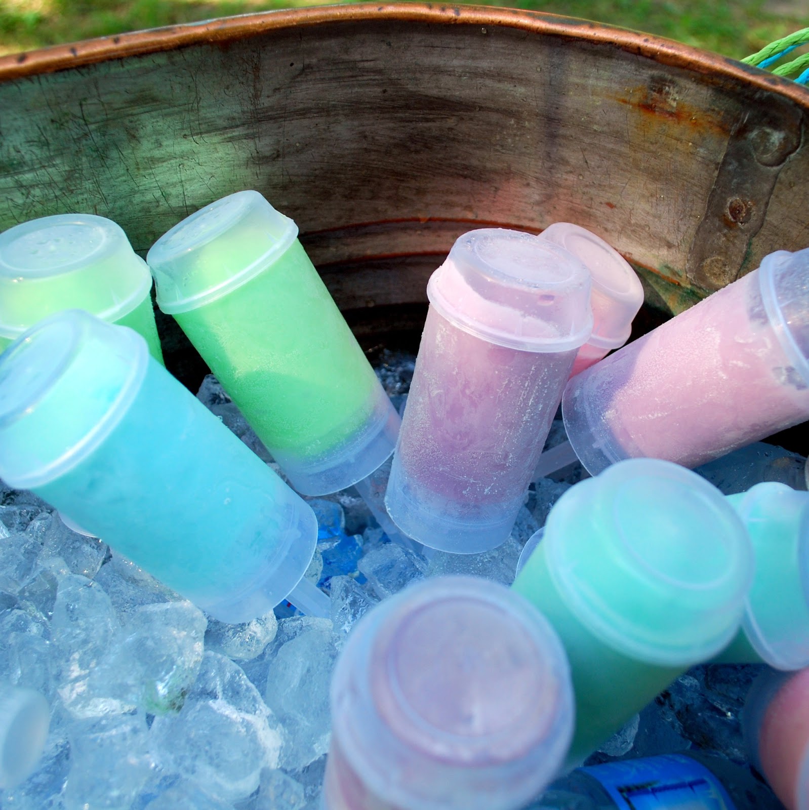 You couldn’t handpick a more perfect July Saturday morning in this place. Low eighties, low humidity, nice breezes and a bustling farmers market and fountain scene. We arrived early to get a great spot, and we found this perfect shady little glen right next to the fountain area. We set up one card table and had a big wagon with a copper bucket in it for our party spread. At the last minute we unloaded several coolers worth of ice cream containers and push pops and waited for our friends to arrive.