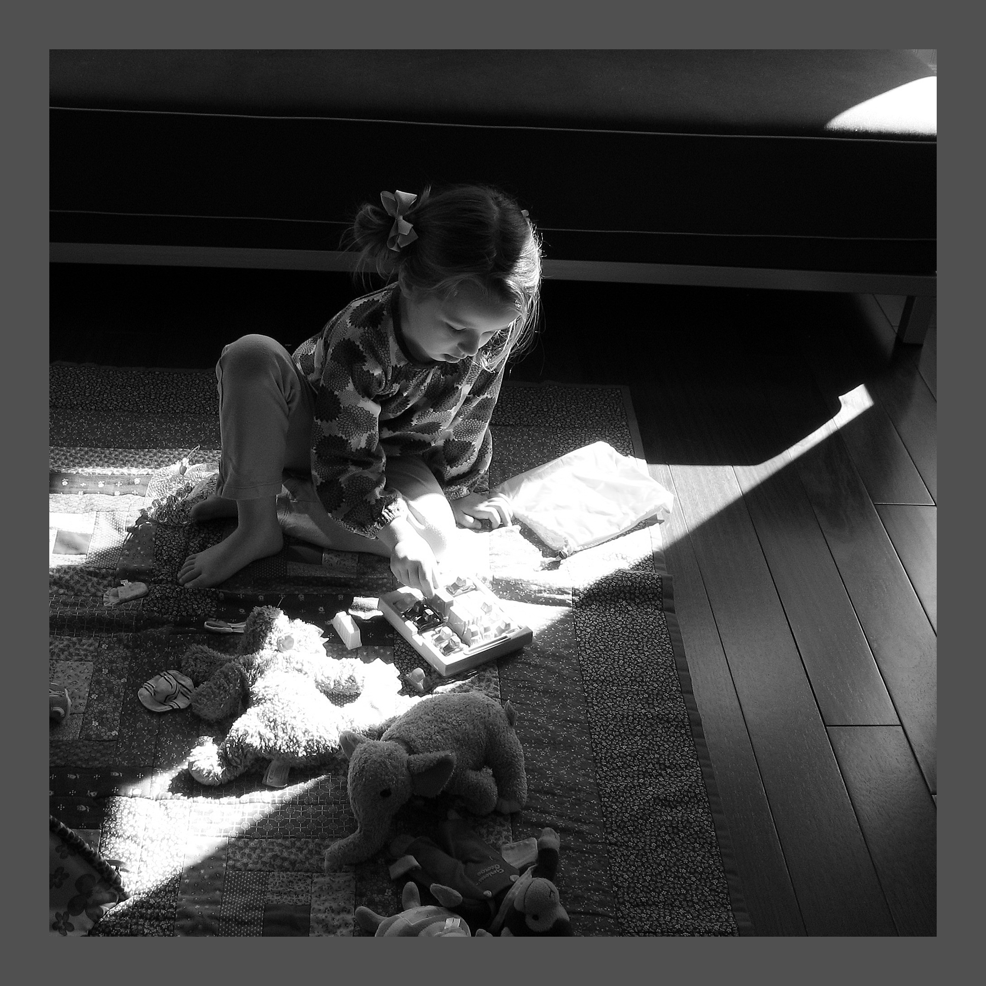 (four) April 2008. The best room in the house in the late afternoon is the back bedroom on the third floor. It’s now F’s room, but before we knew she would join our family, it was a studio space. It was a fun room to complete – it allowed us to move our desks and computer out of corners of other rooms and tuck them away in this sunny spot. We bought a day bed for the box bay, and visiting family and friends had a bed instead of an inflatable mattress to sleep on. E would drag a quilt into this room and cover it with toys and games. I have hundreds of photos of the girls sitting in this light spill over the years. Completing this room with its eight windows planted the seed for the orientation and design of the new addition. This photo takes me back to my early childhood, to Sunday afternoons stretched out on the carpet in the living room, dozing off under the warming blanket of the sun.