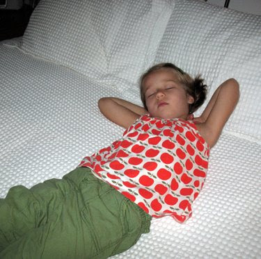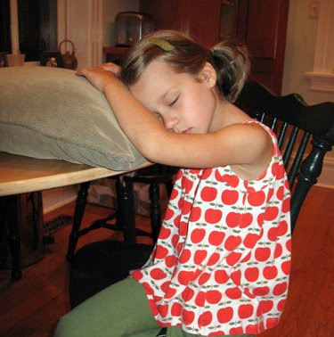 The first photo is after I’ve awakened her (clarification: dressed her still sleeping body, brushed her still sleeping teeth and combed her still sleeping hair) and then carried her down to our bed to rest a bit longer while I dry my hair. I did manage to get her to open her eyes and walk down the next flight of stairs independently, but she just grabbed a pillow and continued sleeping while the oatmeal was cooking. For pete’s sake – it’s not like I’m getting her up before daylight, and she did go to bed at 7 the night before. Kindergarten rocks, and rocks hard. I may need to teach her the joys of espresso before she hits the first grade.