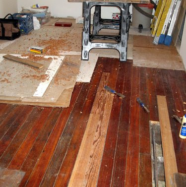 And while we swam and read and weeded and batted the afternoon away at a leisurely pace outside, someone else was inside working on hardwood floor patching. I’m not quite sure what the entire process is, all I know is that it is painstaking and tedious. This room had the most water damage when we purchased the house (portions of the roof had been missing at some point) and the floor had gaps between boards that a toe or two could have slipped into. We’ve ignored this for years because the room has had cardboard down over it and stuff stacked on it since we moved in. When the cardboard came up one day a few weeks back E walked by and said “Holy cow – that room has wood floors! And all this time I thought you had just put in cardboard ones.”