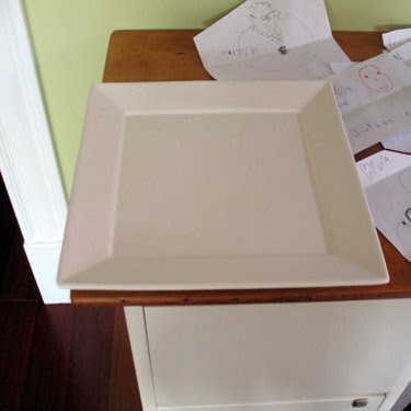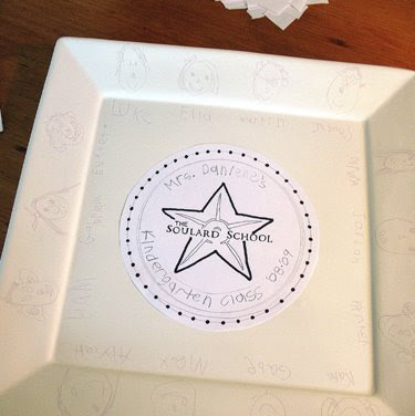 This little end of the year teacher’s gift has turned out to be a very fun project. We decided to do a platter that all the kids could contribute to – a gift made that more special because E’s teacher is moving out of state this summer, and this will help commemorate both a great year with this class, and her time at the school. I thought about the process for awhile, trying to make it as easy as possible for all the kids and their families, and how to end up with a great final product that will be fun to display. Getting fourteen kindergartners together to paint on one plate didn’t seem very practical or precise, so I had them all submit ink or pencil line drawings of their face and their best “signature”. They gave me (very) detailed instructions on what color each line should be. So step one was collecting these items and throwing them all out on the desk.