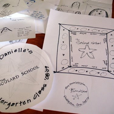 Step five: I reduced the faces and tweaked the final layout including the center logo design. I was getting pretty happy with the overall look but thought that the inside looked a little too “grown-up” compared to the border, so I had E rewrite the letters in the logo so that they had a kindergarten look about them.