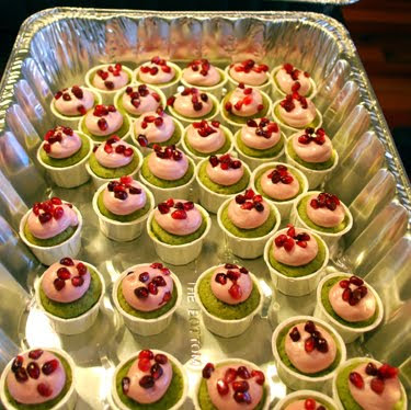 Way more adorable in the baked and topped form. Pink little frothy clouds of pomegranate infused meringue on green tea and pomegranate cupcakes. Yum.