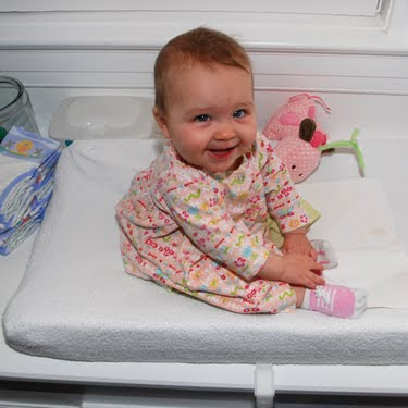 …we’ve had to relocate the diaper changing station to F’s room from the laundry room. It was nice to have the handwashing sink and enclosed trashcan right there, but we’ll make do with this for awhile, and we didn’t think she’d take too well to finding sawdust in her shorts.