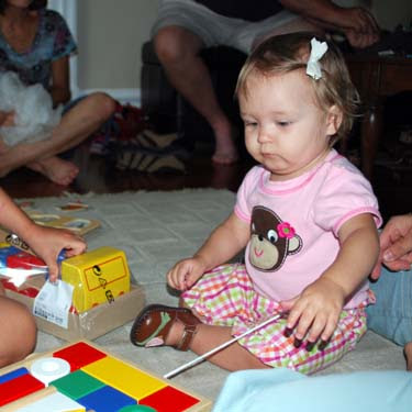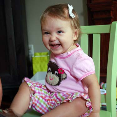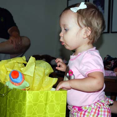 We try to keep things sane around here with the gifts and limit them to family only. After the monkey party (and a good long nap) she opened a special gift from each family. It was the perfect amount, with a perfect gift opener. New shoes went on immediately and were pried off later. A new chair for her room was slowly revealed from under a blanket and climbed into, and several great toys have kept her busy all week. A perfect day now? Donning her shoes, dragging her new toys to the desk in her room, and climbing up on that big green chair to play with them.