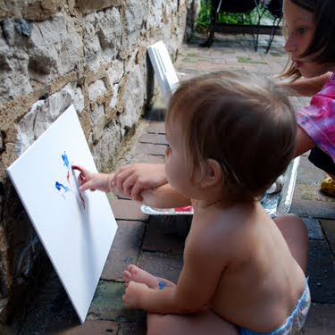 I remember sitting out there that day, watching her work on that board, while M took photos and we enjoyed a bit of the afternoon sun. She sat there for quite a while, trying out paint brushes and her fingers. Seems like ages ago. Look at that chubby little finger and that baby concentration on the task at hand. That child had an extraordinary focus, even at a really young age. The exception maybe being an open book, that child was never happier than when she was sitting in front of a blank canvas.