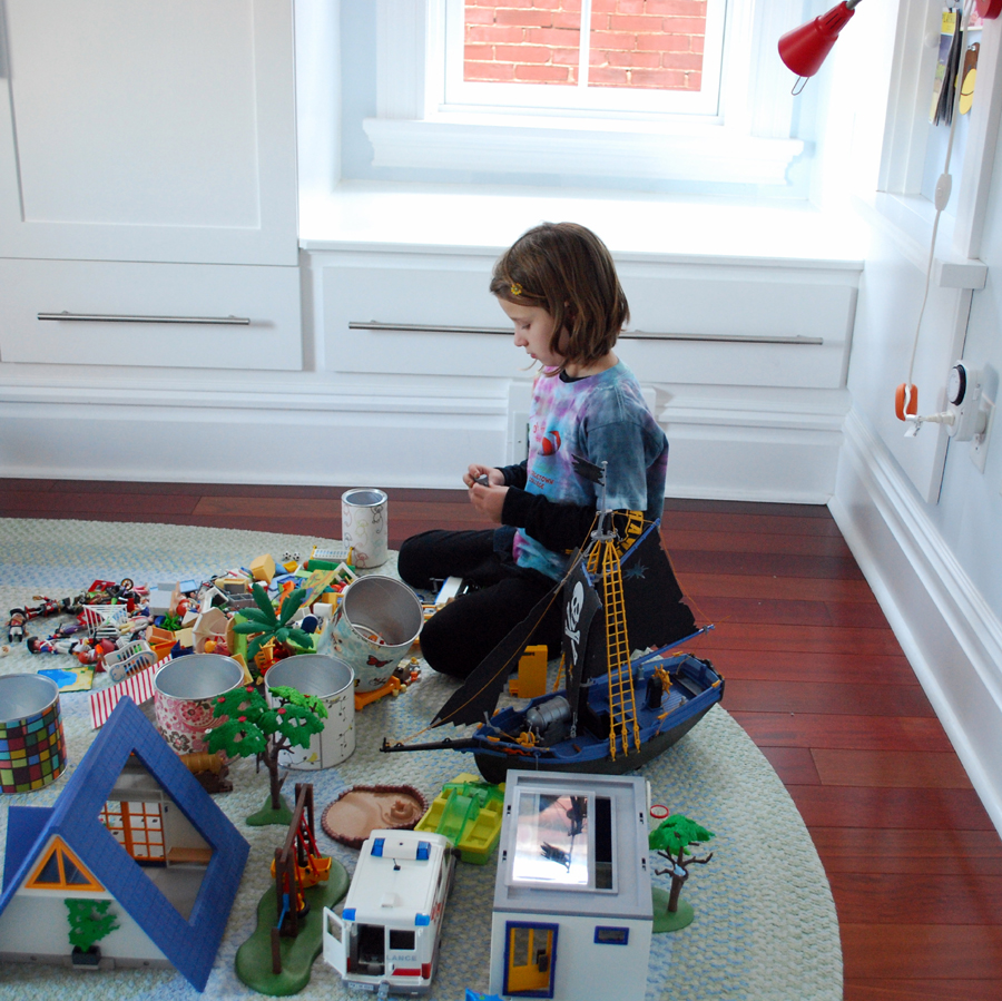 We love our Playmobil around here, but it can only sit so long before it’s got some dust on it, and the patterns of play are visible in it. So every other month we do a clean sweep – everything off the ledge and out of the containers – and we dust and clean and set up some new play. She decided to shift the pool and the boat into the drawer for the winter, and turned the hospital back into a hospital after using it as a gigantic house for awhile. This was all done during naptime, of course, because those little things are oh, so enticing…