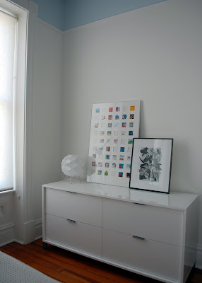 So this Friday finds us with a lot of sunshine – hooray! It bounces nicely off the dresser that came last Friday and that we put together this week. This is one of those furniture items that falls in the category of not-really-needed – we have lots of clothes storage already- but really wanted. When our room isn’t full of stuff that used to go elsewhere (computer, desks, etc.), it’s a fairly simple room with just a bed and some wardrobes. The Eames rocker that was a gift for this room currently resides in the nursery, and will probably stay in there for a few more years. I’ve just been wanting a nice, simple piece for this area – a place to put a lamp, stack some artwork on, hang a few things over. We’ve looked for years for just the right dresser, wanting something white, something simple, but all we ever found was a sort of traditional looking painted piece or something too industrial or trendy. Or too expensive – I can certainly locate the “perfect” piece of furniture at a less than “perfect” price point.