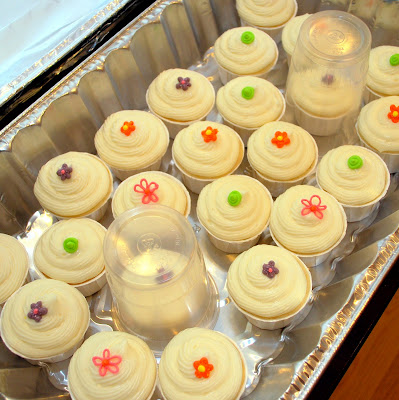 I felt like the cupcakes were simple and delicious on their own, but still… cupcakes just sort of call for a little something special. I had some leftover royal icing from the shower cookies so I tried piping out a few hundred different shapes – flowers, dots, butterflies, etc. – onto wax paper and leaving them to harden over night. They turned out to be just the thing these cupcakes needed.