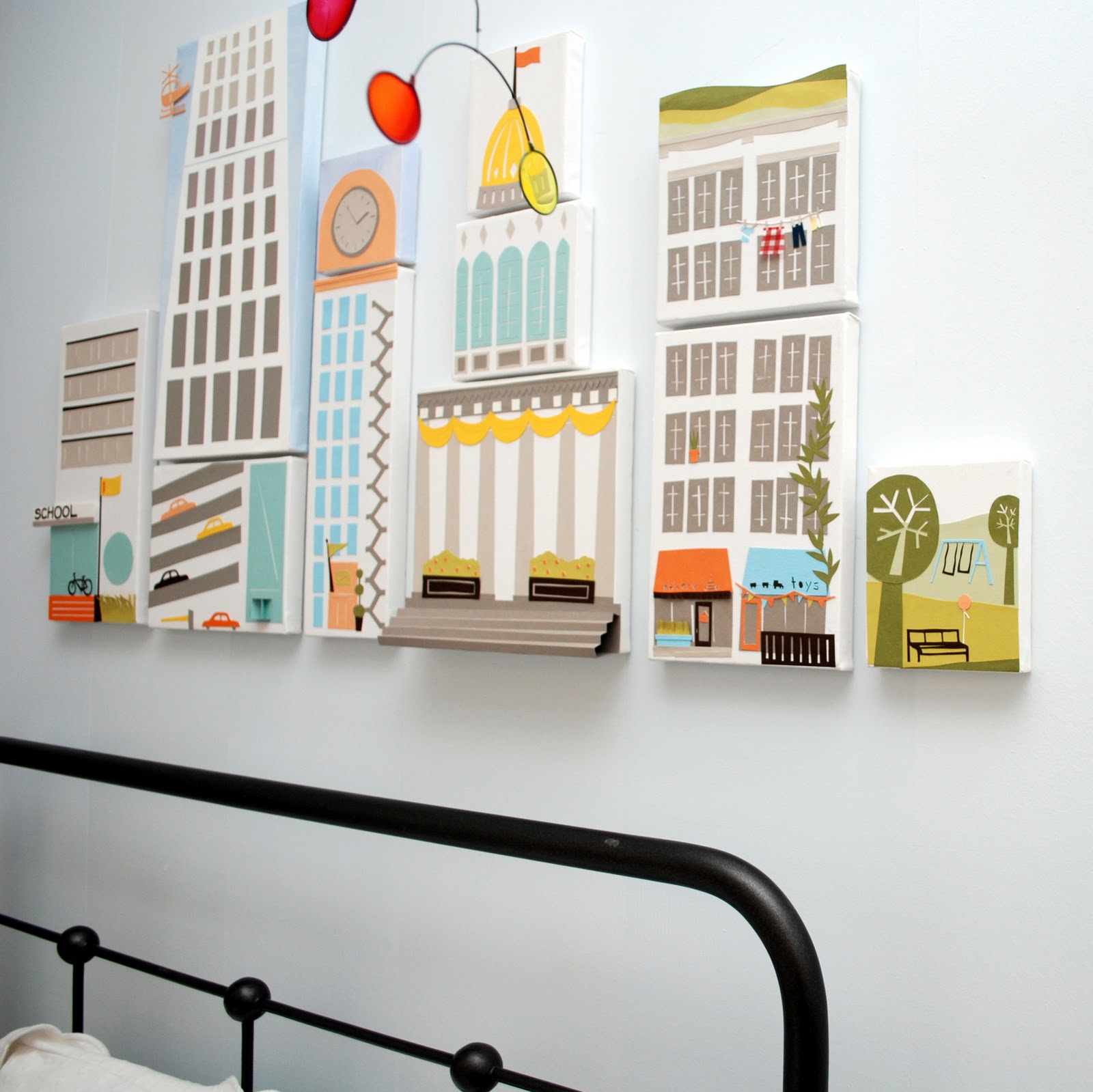 Here’s the latest (and probably last) addition to the cityscape for my nephew. The park. I thought of putting a kite, but then the balloon seemed right. And I love it. I drew inspiration for the trees from the book Follow the Line, which was the starting point my sister gave me when she asked me to do this for C. Once I finished the park, I really wanted to put these on the wall, step back and look at them for a few days. And since M was at work (self-punishment for taking a vacation day on Friday) and E was still up (and suddenly hyper), we decided to hang them with museum putty and stand back and admire our my work. She just thinks it’s hers because I did so much of it in her room with her standing over my shoulder critiquing each cut and paste.