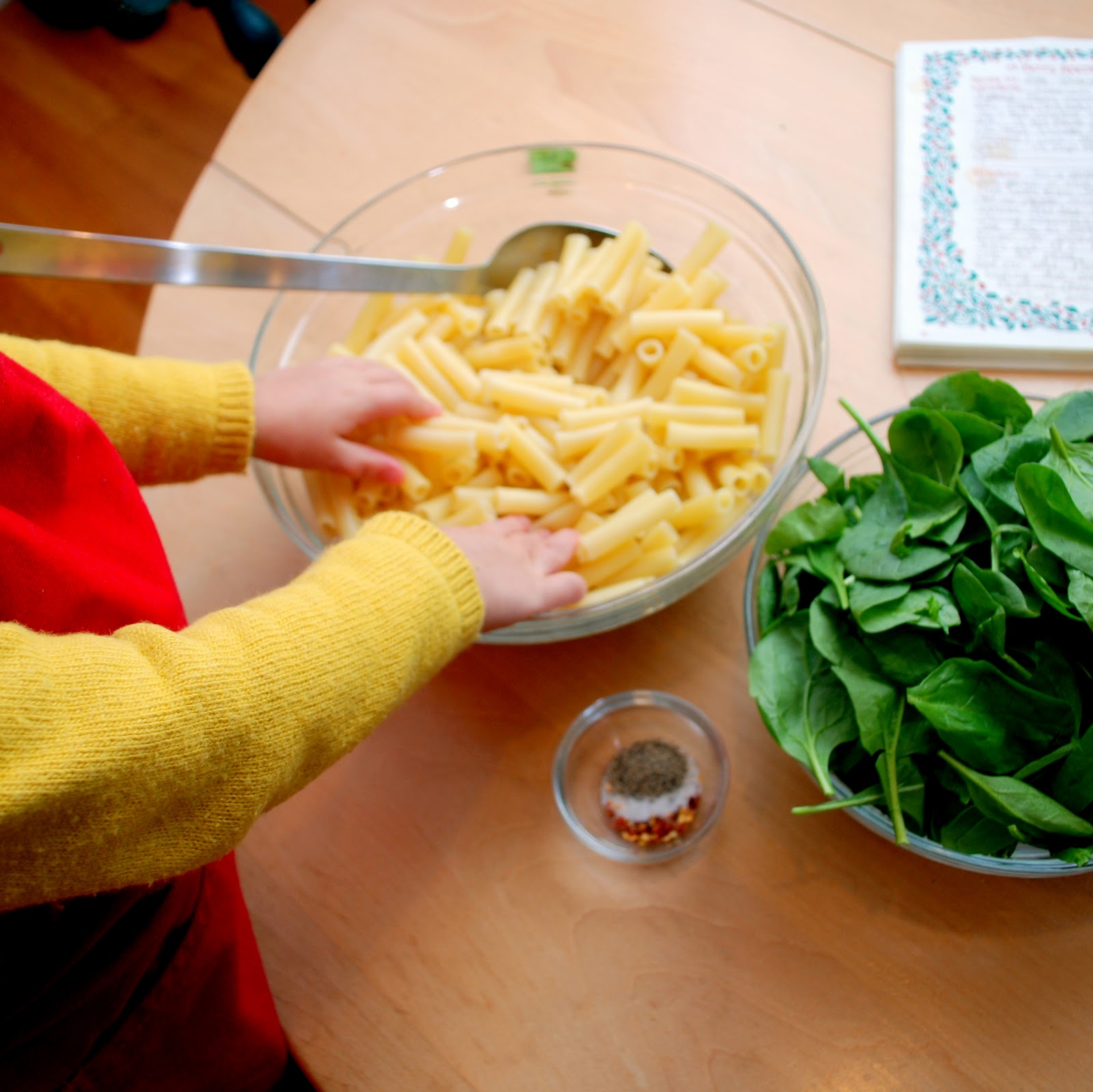 Her cheeks may be chubby, but not that chubby. This Friday finds us in the kitchen, both before and after E’s Feast of Thanks at her school today. F’s favorite thing to find herself doing is cooking. “I cook with you?” she asks anytime you get remotely close to the kitchen. This morning we were making a pasta dish and corn muffins. The pasta was cooked, the sauce was simmering on the stove, and she was supposed to be tearing the spinach leaves into bite sized pieces. Usually tearing is great fun but today there was a distraction.