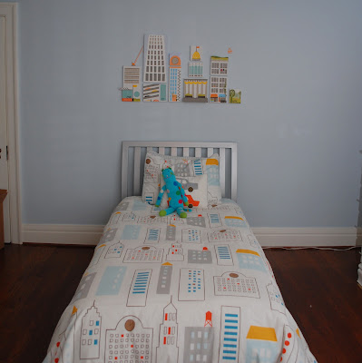 Our little city traveled hundreds of miles and finally got unwrapped last Sunday morning. I had about fifteen minutes to hang it before we were scheduled to be at breakfast with family, and once I looked at the photos I realized that its still a little crooked. We’ll be back in a few weeks, so I’ll spend a little time spacing it out better and getting it all straight, but for now it’s up, and much loved. I think I’d like it a little lower, but my sister is worried a bit about it getting knocked with a wayward pillow, and she’s probably right. She’s spent a little more time with that guy than we have! He’s pretty pleased though, and I was so excited t see how well the colors and the shapes looked with his bedding – not a copy, but nice and complimentary. He seems happy – and that’s what really matters.
