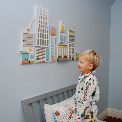 Our little city traveled hundreds of miles and finally got unwrapped last Sunday morning. I had about fifteen minutes to hang it before we were scheduled to be at breakfast with family, and once I looked at the photos I realized that its still a little crooked. We’ll be back in a few weeks, so I’ll spend a little time spacing it out better and getting it all straight, but for now it’s up, and much loved. I think I’d like it a little lower, but my sister is worried a bit about it getting knocked with a wayward pillow, and she’s probably right. She’s spent a little more time with that guy than we have! He’s pretty pleased though, and I was so excited t see how well the colors and the shapes looked with his bedding – not a copy, but nice and complimentary. He seems happy – and that’s what really matters.
