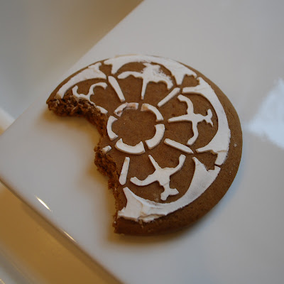 I made two batches of the best gingerbread recipe ever, and stacked the parchment lined sheets on top of each other. Then I busied myself with other tasks while the dough chilled for a few hours. Just before ten I rolled the dough out in a bed of flour, cut fifty or so large circles, and transferred them to sheets. I rotated cold sheets in, hot ones out every ten minutes, and the house filled with the scent of warm spices.