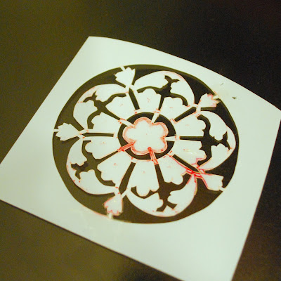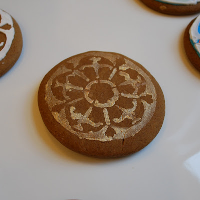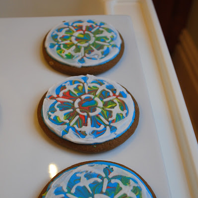 Around eleven or so the first few trays were cooled enough. I took the stencil of one of the rose windows in our church’s sanctuary that I had made while the dough sat chilling, and tried brushing gold luster dust over the surface. The end result was pretty cool, but I still liked the idea of using a little icing, and I was concerned that the gold dust might rub off and just end up looking like a giant blob of sparkle. I tried white icing over the stencil, which was pretty cool as well, and certainly stood out more than the gold. But by now it was approaching midnight, and all my good reason had long since turned in for the night. What about the stained glass? I knew I could do it – so blue icing was made, with a little red and yellow swirled in for effect. A few hours later the base of the cookies were complete and we turned in (finally) for the night.