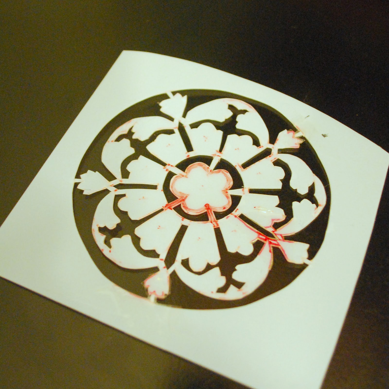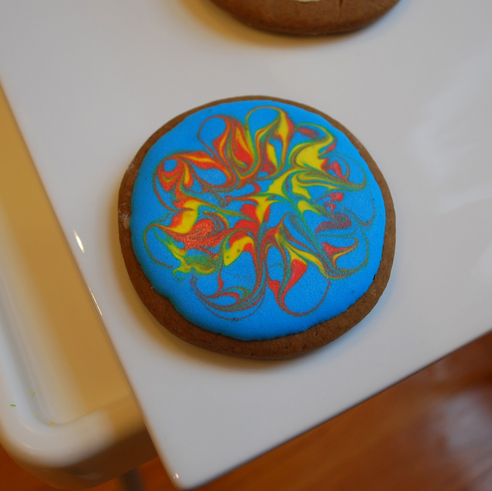 Around eleven or so the first few trays were cooled enough. I took the stencil of one of the rose windows in our church’s sanctuary that I had made while the dough sat chilling, and tried brushing gold luster dust over the surface. The end result was pretty cool, but I still liked the idea of using a little icing, and I was concerned that the gold dust might rub off and just end up looking like a giant blob of sparkle. I tried white icing over the stencil, which was pretty cool as well, and certainly stood out more than the gold. But by now it was approaching midnight, and all my good reason had long since turned in for the night. What about the stained glass? I knew I could do it – so blue icing was made, with a little red and yellow swirled in for effect. A few hours later the base of the cookies were complete and we turned in (finally) for the night.