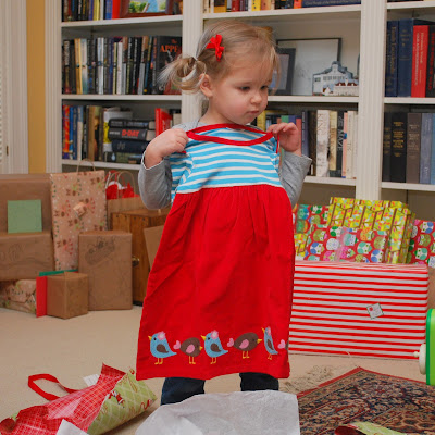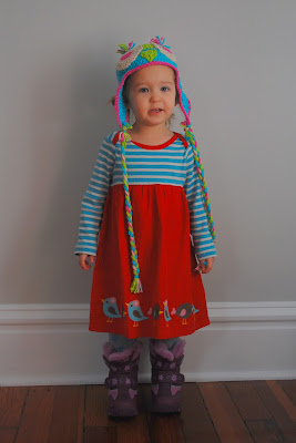 I know that I said that I’d be back in the new year, but this girl is cracking me up. She got two hats for Christmas, a gold and brown colored one (below) and a hand knit one in aquas and pinks (above). She also got this dress (see below-below) which she wore two days in a row and begged to wear three days, and then four. On Tuesday we woke to snow, so you can imagine her joy when she got to wear 1. her new birdie dress, again, 2. her snow boots, and 3. a new hat. I grabbed the gold one out of the drawer and she stomped one of those snow boots promptly down.