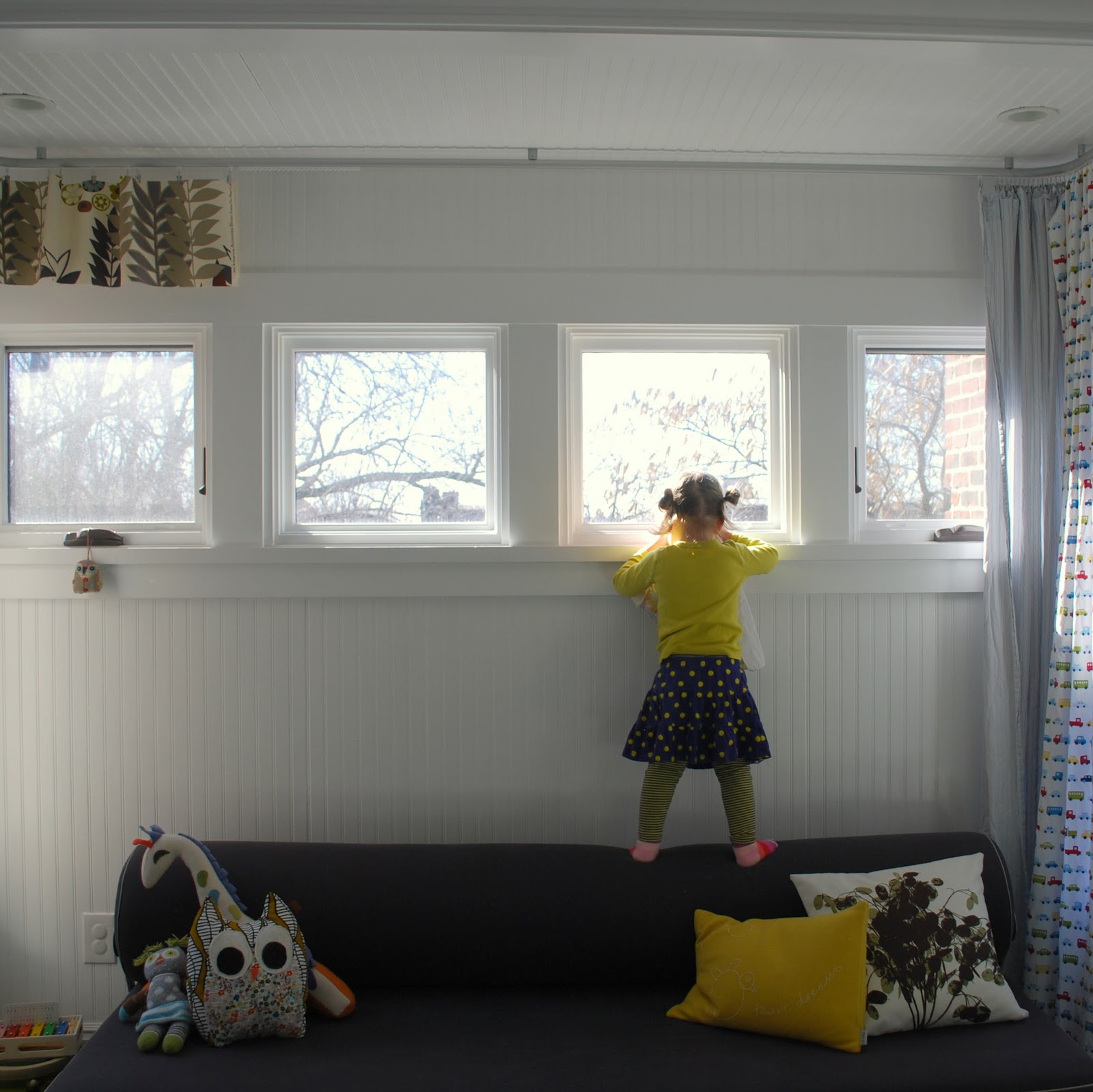 Two more things: Third – the real curtain won’t hang from clips, but will be mounted to upholstery hooks so you won’t see a gap at the top, and likely won’t see much of the track either. And last – I went to get the camera and came back up to find this. Um, hum. Sneaky.