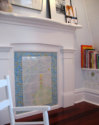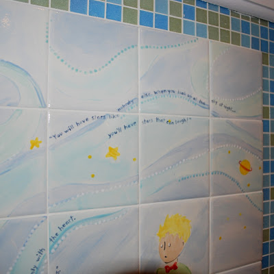 It’s a scene from The Little Prince and I have several quotes from the book scattered around the tiles, and I signed it love, mom. The glass tiles were special ordered in that color combination from a local tile shop. Tile brand is Bisazza.