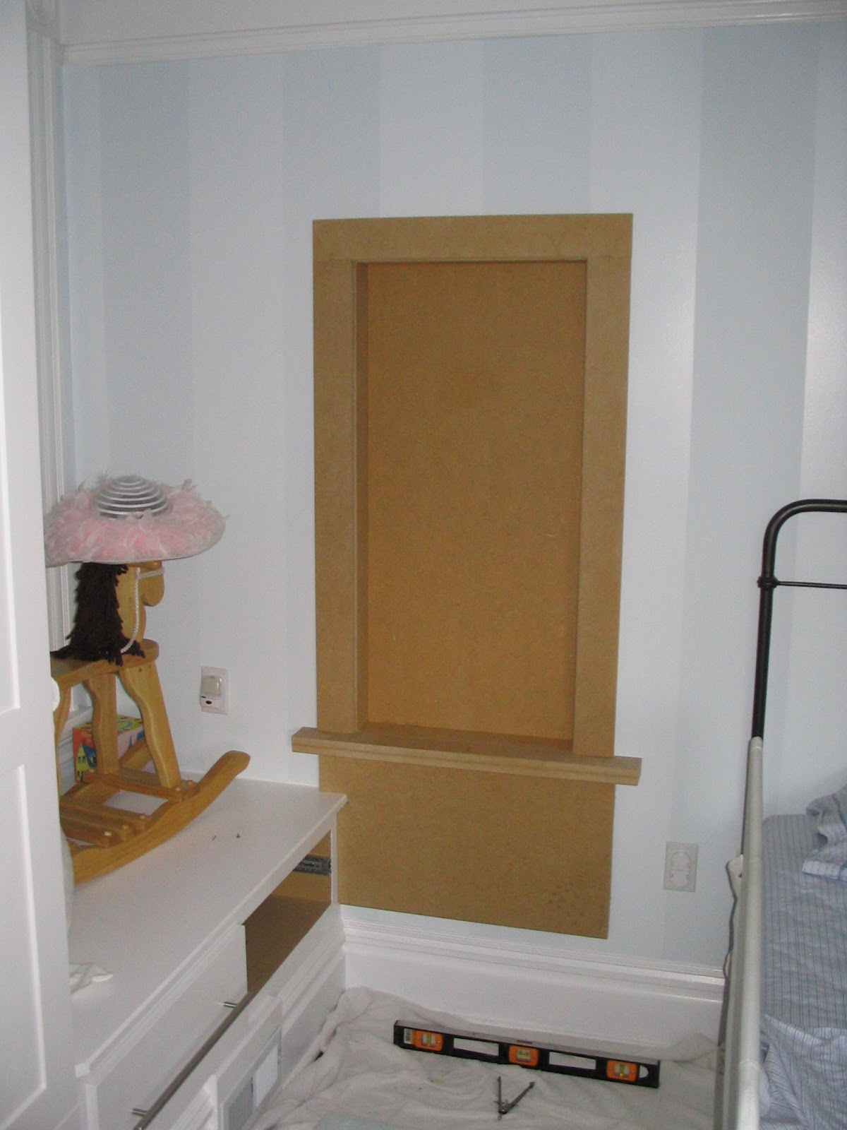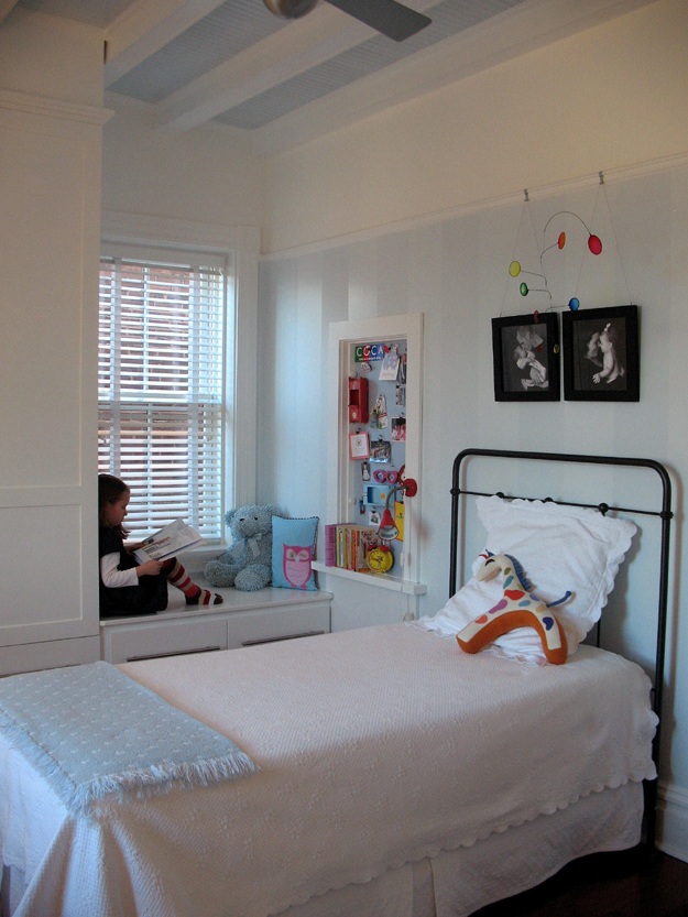 One of my favorite parts of the room is the hidden access door to the mechanical room. For E’s third birthday we made this access frame and panel with small ledge, inserted a piece of homosote covered in blue linen and she uses it as a tackboard and bedside table. Windows are all new on this floor – Marvin Ultimate Double Hung.