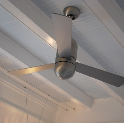 The fan is one of many fans in our house – all are from Modern Fan Company and ordered locally through Centro Modern Furnishings. We also ordered all our Artemide fixtures through them, and the small Tolemeo lamp is the one above the built in dresser. The red lamp by the bed is from IKEA.