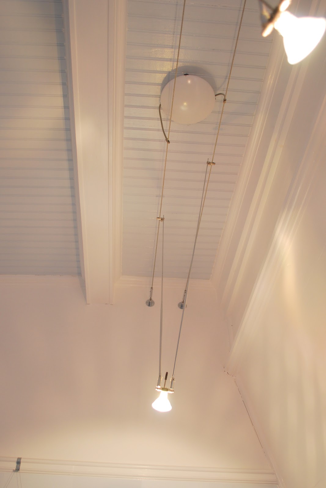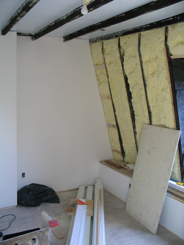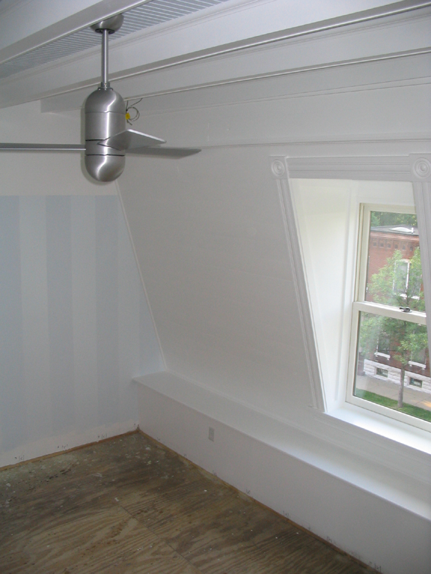 Speaking of ceilings – that’s probably one of the best features of the room. Here’s the short version to the most popular question I got yesterday – How do you keep the attic cool??? The original attic had no insulation – just masonry walls (three wythes of brick) with no plaster, and wood roof joists with a flat roof above. By flat I mean not really flat – it drains to the back of the house, but at a very low slope. So the ceilings also slope from the front mansard to the back. Several problems with inhabiting these spaces. First, you have to insulate them, and they were never designed to be insulated / vented. The roof joists are big enough to carry the load of the roof, but not the additional load of a hanging system and drywall or plaster. And even if they could carry the weight of a new ceiling – any insulation stuffed into the spaces between the new ceiling and the old rafters would need to be vented. That meant installing a vent at each joist bay along the side walls (through the brick) or dropping the ceiling low enough to allow insulation to be added, plus an additional 2″ of airspace minimum between the top of the insulation and the bottom of the roof rafters. We hated the idea of losing the charm of the ceiling, as well as the height, so we bit the bullet and used Icynene spray foam insulation installed by the pros.