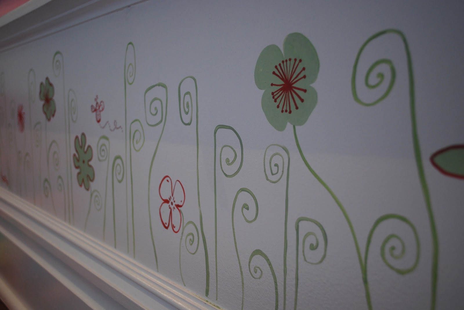 I painted the flowers and bugs on the wall mostly while E was sleeping in her crib at night. They were inspired by a card I received in the mail from a friend.
