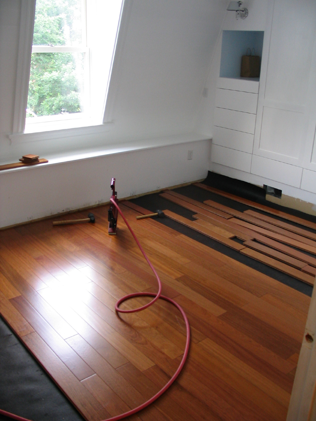The floors are Brazilian cherry and I’m sorry that I don’t remember the manufacturer. They’ve held up very well for 8+ years, and they are very similar in color to our old pine floors in the rest of the house (which is why we chose this flooring.)