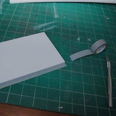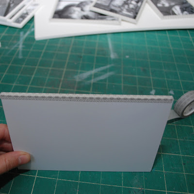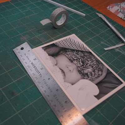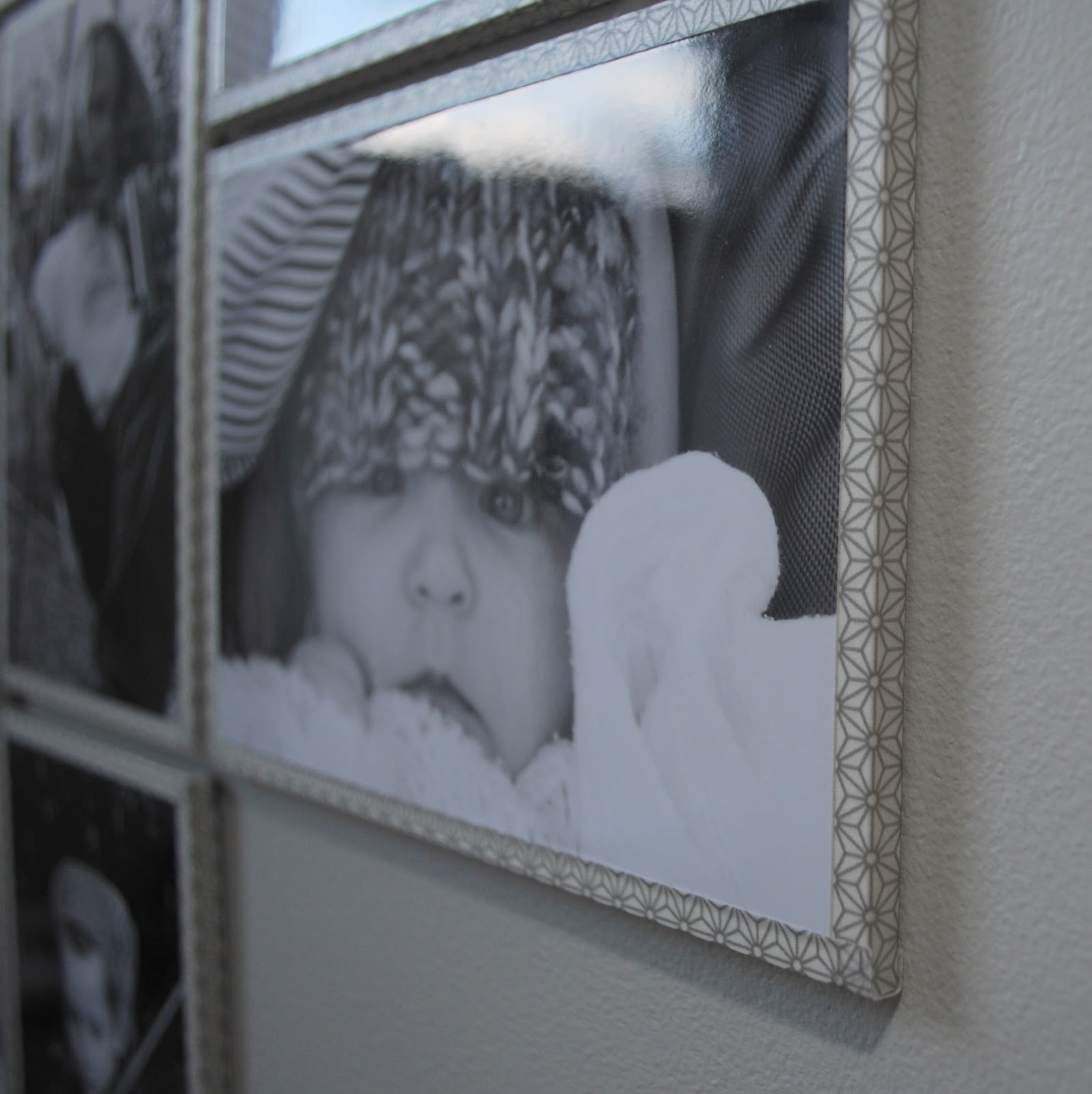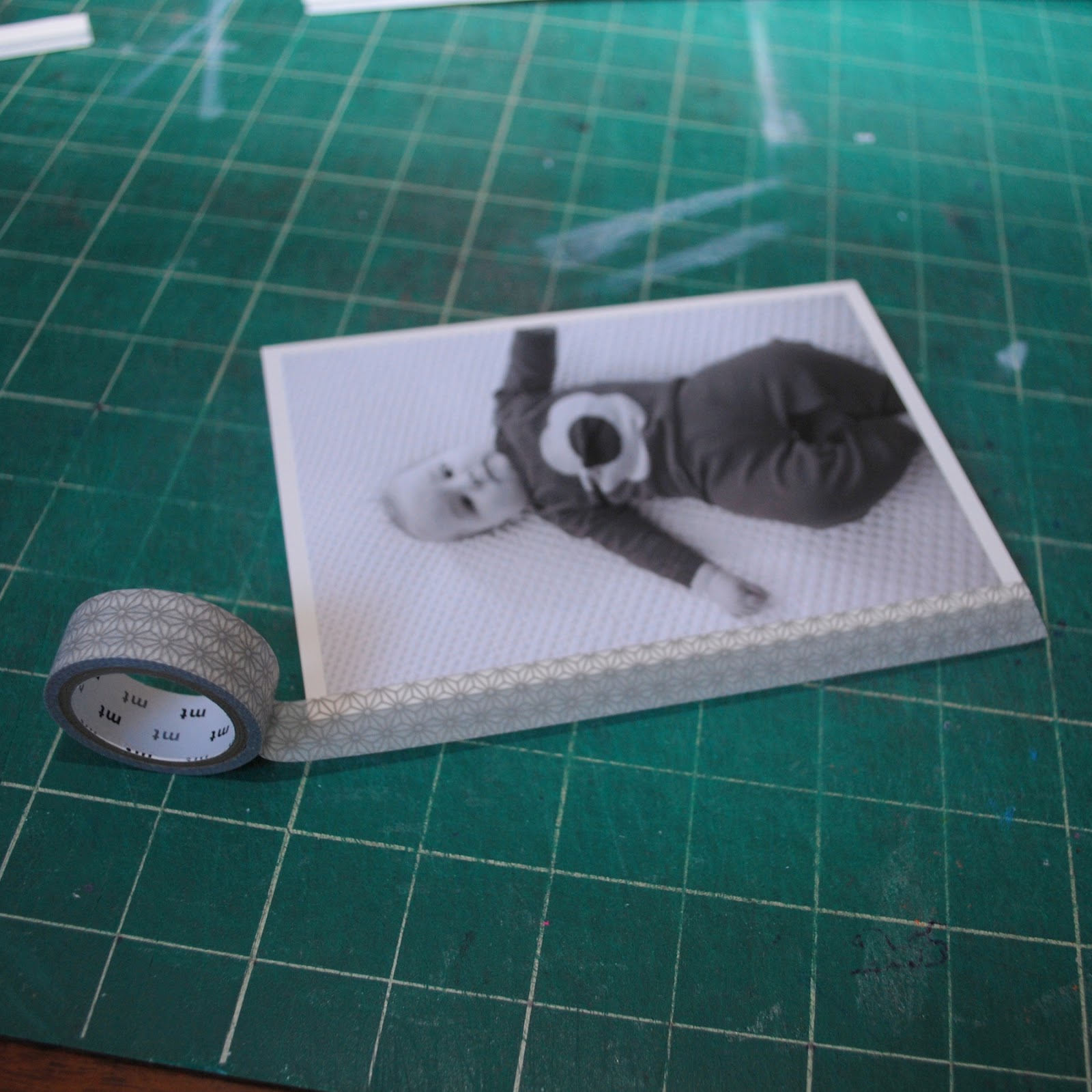 I had some foamcore scraps that I had given to E that were still hanging out in her wardrobes waiting for a project. I spray mounted a 4×6 photo to some and cut the foamcore about 3/16″ wider on each side. I then wrapped the edges in a silver patterned Japanese washi tape that I got in a pack of two from The Container Store.