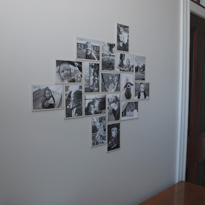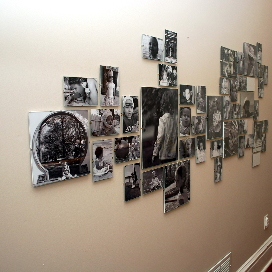 There were also a couple of things that I didn’t like about this display. First – we don’t have an IKEA nearby, so I wasn’t very good about getting new frames to add to the wall. And second, the glare on the glass is pretty intense as you walk down the hallway in either direction – in fact, it’s pretty hard to get a photo taken where you can see the photos and not just the reflection in the glass. I know hallways and staircases are popular places to hang collections of photos, but it is hard to step back and really see what’s on the wall when you are viewing them at that sharp angle. We’re getting close to painting this hallway again – right now it’s the taupe color that we’re getting rid of in the house, plus the hallway walls are pretty banged up from years of house projects. I thought about just taking these photos down for awhile until I could tackle something similar again only with both kids this time.