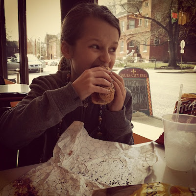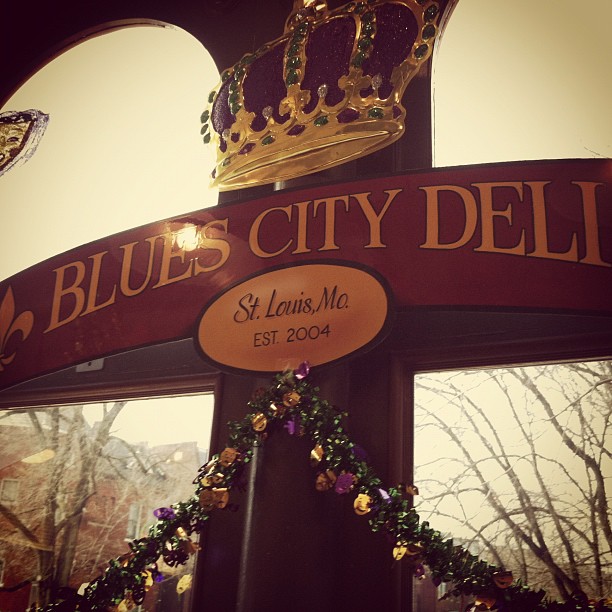 It’s the big Mardi Gras Celebration in the neighborhood which means those of us without off street parking are stuck in (or out) all day. The roads fill up by nine a.m. and we hunker down and watch the crowds go by. This year the deli stayed open despite the fact that it’s their slowest day of the year – everyone bypasses it for the celebration a few blocks down. Which means we got a seat – and a window seat at that. This place is so popular we’ve rarely sat at a table in the eight years it’s been here. We just grab the food and take it back home, or to the curb, or the front yard.
