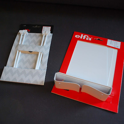 While we were in the store we saw these two new products. I say “new”, but maybe they’ve been around for awhile and we just didn’t know about them until now. The product on the left snaps into the upright standards and keeps books and other items from getting knocked off the desk. The product on the right is a pair of bookends that slide over the front of the shelves.
