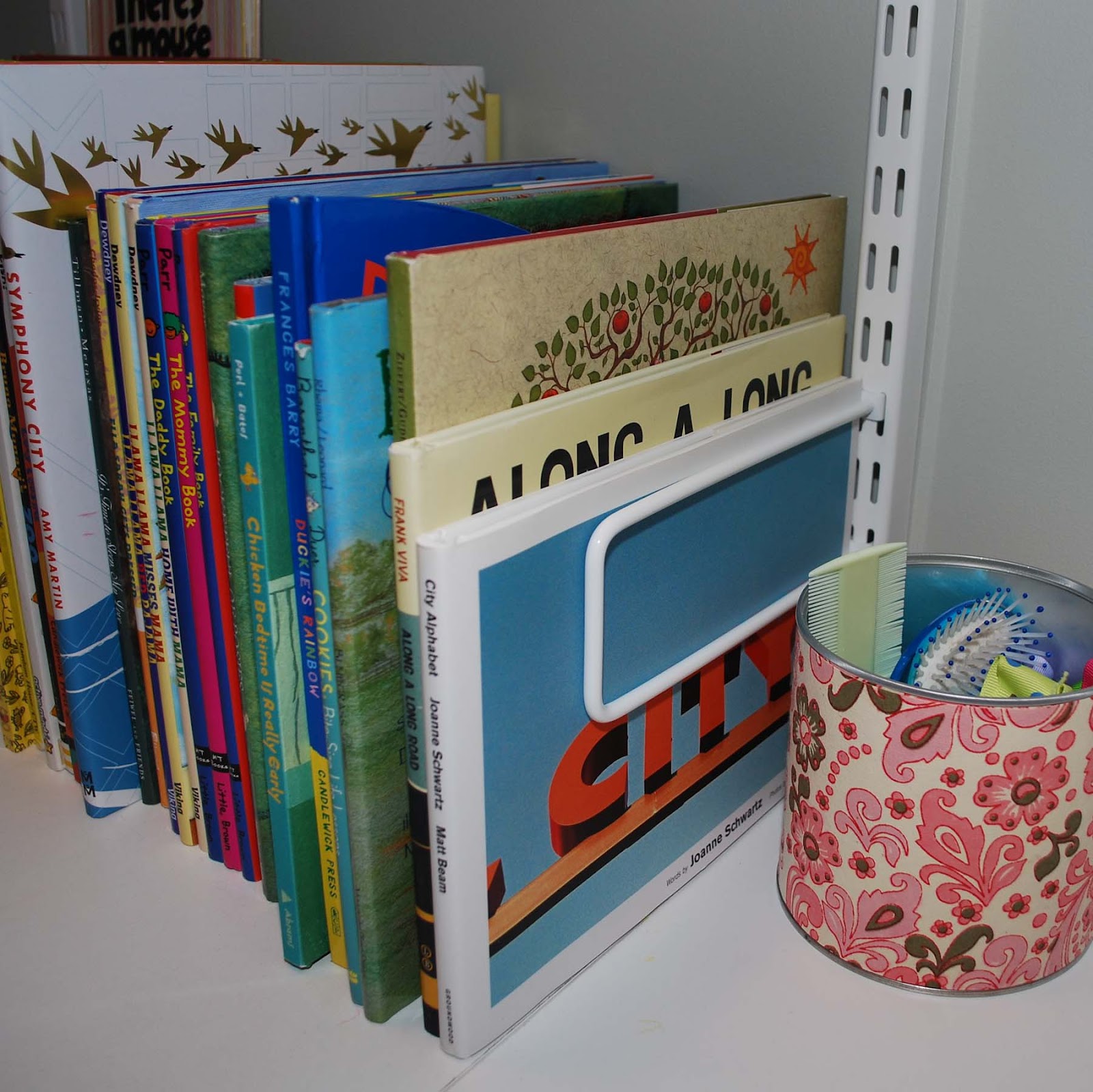 Two simple components for this system that work really well. I feel a lot better having some breakable (and meaningful) objects on that upper shelf, like hand painted picture frames and coin banks, now that I don’t have to worry about nearby books toppling over like dominoes. Now I just have to worry about them toppling because of curious hands…