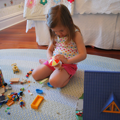 So when her big sis takes off with Dad for awhile, the first place she wants to go is E’s room. Out comes the playmobil – and she delights in the joy of an hour of freedom, with no one dictating the play or squeezing those delicious arms, baby soft as they might be. I just sit back and watch this transformation in amazement. The first child has complete control of their personal space – to play alone, or to climb into a parent’s lap when closeness is desired. It’s a harder fought battle for #2. I think she realizes this, and revels that much more in the slices of individual space that she sometimes gets. And I love watching who she is in these moments – I’ve missed them of late by having to work again on Fridays. I have to work – much like her sister does – to not swoop in and join the fun. She needs this time to do her own thing, be her own master of play.
