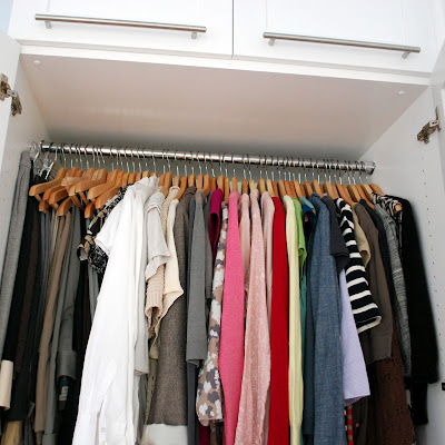 I realize that all the closet specialists would chide me for not having the appropriate spacing between clothing so that it hangs and breathes correctly. I’m okay with this spacing though. In my opinion clothes do not need more square footage for their existence than I do. If the hangers fit, that’s all that matters.