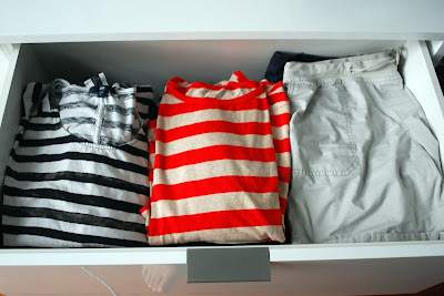 So back to the closet. After the mad filing I did a month or so ago, I had another drawer in the dresser to play with. I was able to fit all my casual shirts and sweaters in that drawer, plus shorts. I did a ton of picking through and cleaning out to really whittle out the things that I no longer wear. I used to keep a giant stack of paint clothes, but my painting days are few and far between now so it wasn’t really necessary. There was a time in this life where I honestly needed a week’s worth of paint clothes – but those days of round the clock renovation projects and laundromat visits are thankfully in the past. One pair of messies are enough. In that vein I continued.