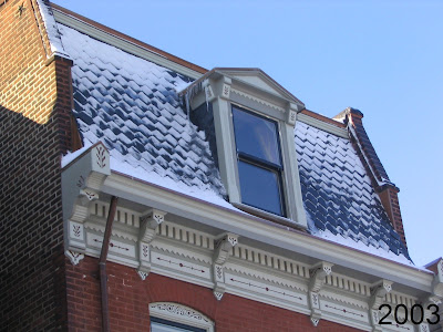 More tuckpointing again in late 2003, those areas on either side of the new slate and copper roofs, and now we also had a rebuilt dormer. You can still see the unfinished walls inside the window. We were working pretty hard on the attic at that point, finishing off a nursery for the little one that had just moved in.