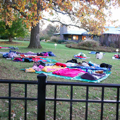 Later that afternoon E and I headed over to the garden for a sleepover. An outdoor sleepover. With no tents. Here’s our campsite, an explosion of colorful sleeping bags and tarps. Yesterday afternoon was warm, but the temperatures quickly fell. Everything was covered in a serious layer of dewy wetness by the time we turned in for the night around 11:30.