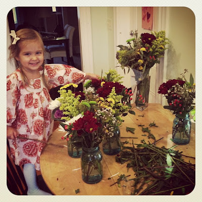 Yesterday started out with some indoor flower arranging – I picked up a bunch of $5 sleeves of various flowers and F and I arranged them in mason jars. These will go on the tables tomorrow morning for Grandparents Breakfast at E’s school.