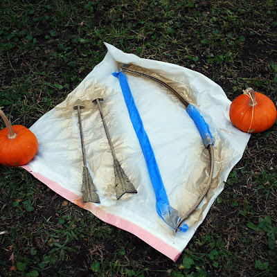 We taped up a few portions of E’s Artemis’ bow and arrow and hit the rest with a first layer of glittery gold spray paint.