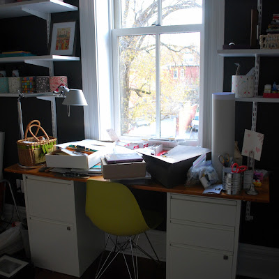The shelves are slowly filling up as I find some time here and there to sort through and organize and collect and purge the creative things we’ve amassed over the years. On our big trek to Georgia each year for Thanksgiving we end up hitting Atlanta right at rush hour. We’ve found that we can get off the interstate at the north end of the city and stop in IKEA for a bit, pick up those things that we’ve been wanting all year, eat some Swedish meatballs, and get back on the road after most of the mess has died down. This year I was super prepared with a list / price / item numbers. A lot of them had to do with storage pieces, and also some matching hardware for the new things we are adding to the house – like pulls for E’s new desk.