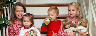 We always make the kids wait at the bottom of the stairs before they rush into the den to see what treasures were left by the big guy. F is usually the last one down the stairs – she likes to sleep in, and she’s also not used to the Eastern Time Zone, so she’s often the sleepiest (and sometimes grumpiest) of the lot. When I was looking at photos on the camera this morning, I saw the photo above, and instantly wanted to pull up the old photos from years past. It’s fun to look at the kids get older, and also how many years of wear they get out of their Christmas pajamas. Three years ago the girls were rolling up the sleeves and the legs of their pj’s – this year a lot more legs were showing!