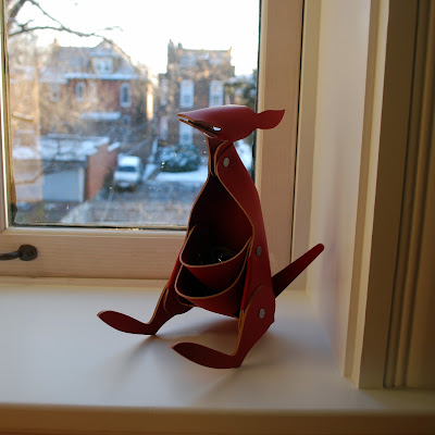 I got this new red leather kangaroo from M and the girls for Christmas. It holds various little desk items, and special notes in the mouth, if you so choose. I love it. And I love the desk area. I’m excited to refinish some more of the big pine boards we salvaged out of the attic to make a longer desk area – one that spans the width of the room – and get the computer out of our bedroom again. And maybe even bring home one of my grandmother’s sewing machines!