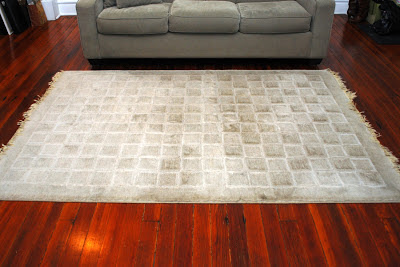 Also purchased at Intaglia – I think it’s roughly 5’x8′ and it’s cream colored, with a pattern of squares. The rug itself is in good shape, but the fringe is showing a little wear. It could be removed or replaced fairly easily.